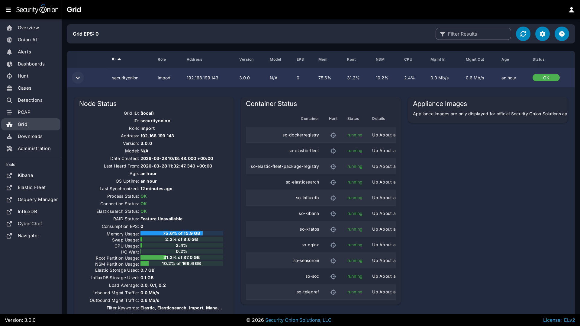 The Version field shows the version of Security Onion installed on this node.
