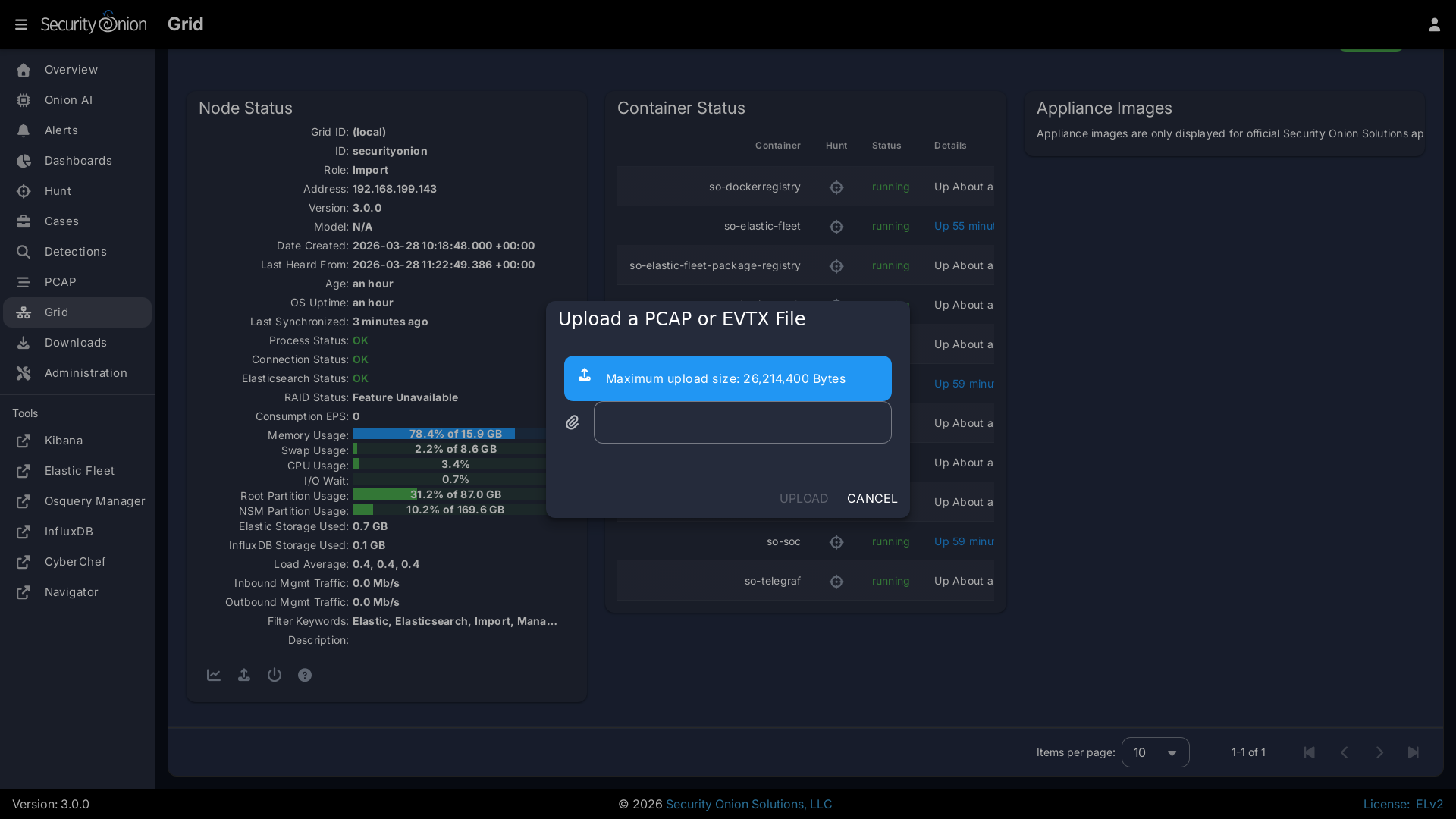Depending on the node type, there may be an additional icon for uploading your own PCAP or EVTX file. Clicking this icon results in an upload form. Once you've selected a file and initiated the upload, a status message appears. Uploaded PCAP files are automatically imported via so-import-pcap and EVTX files are automatically imported via so-import-evtx. Once the import is complete, a message will appear containing a hyperlink to view the logs from the import. Please note that import is not supported on heavy nodes. Also note that this import method is designed for smaller files. If you need to import files larger than the default max upload size then you will need to either change the max upload size via the Configuration screen, or manually import via so-import-pcap or so-import-evtx.