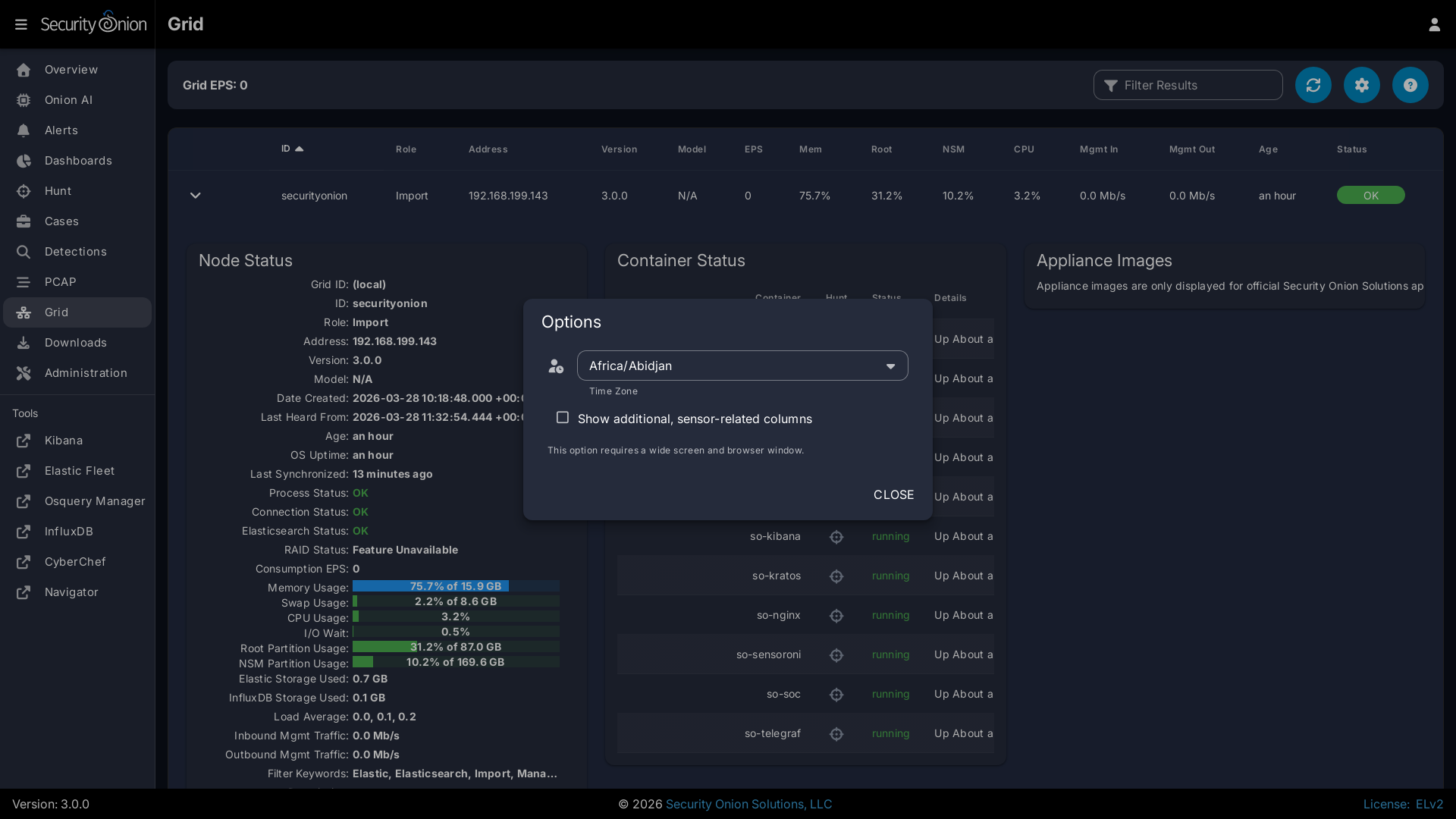 The options dropdown near the top of the page includes a checkbox which will show additional sensor-related columns in the table. You can use these sortable columns to help identify sensors that may be underperforming or due for a hardware upgrade. As these additional columns take up significant screen area, they will only be visible on wide displays where the Security Onion Console web browser window is wide enough to show a large number of tabular columns.