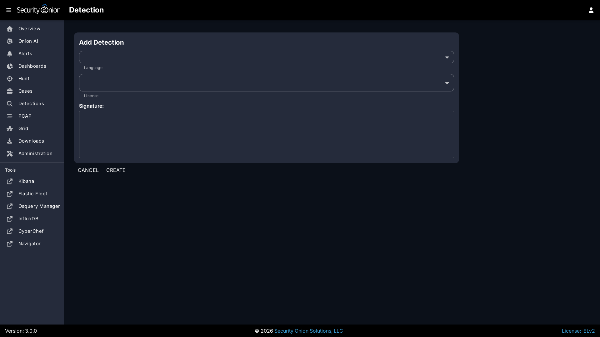 To add a new Sigma rule, go to the main Detections page and click the blue + button between Options and the query bar. A form will appear where you will: