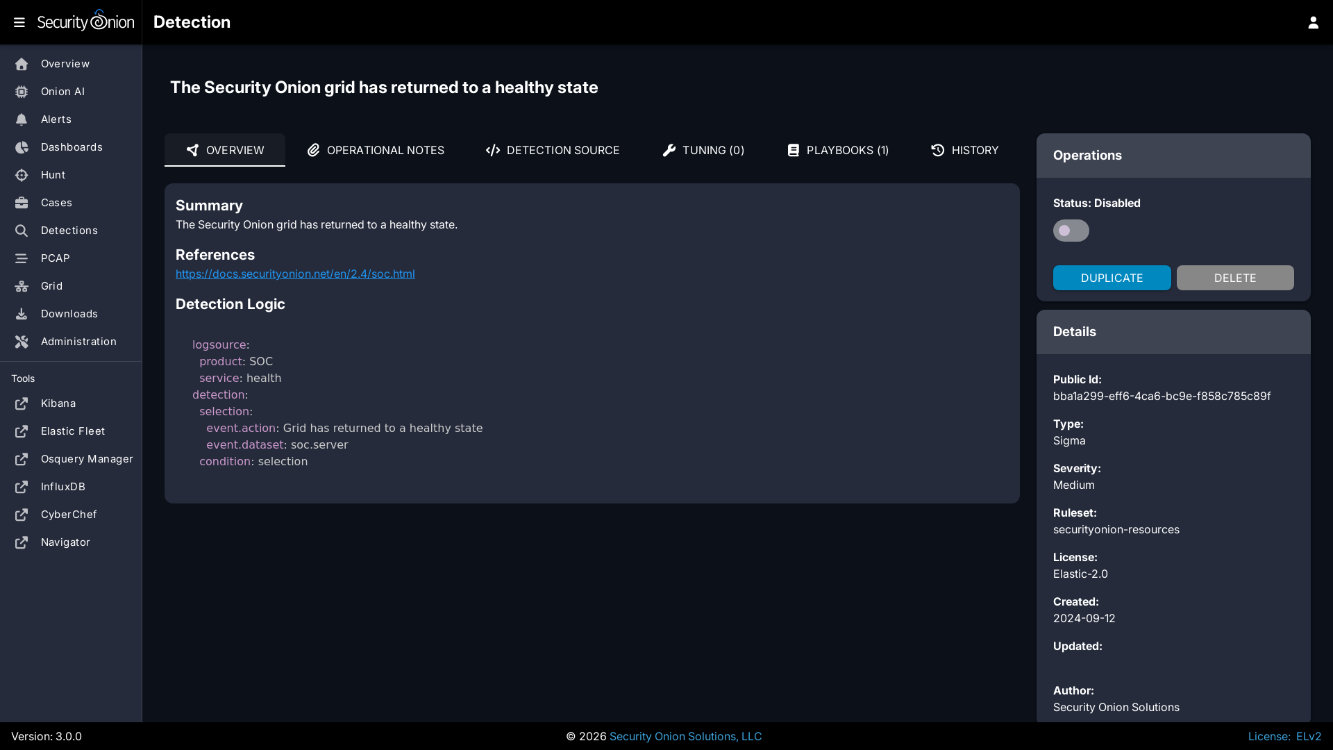 Once you've used one of these methods to reach the detection detail page, you can check the Status field in the upper-right corner and use the slider to enable or disable the detection.