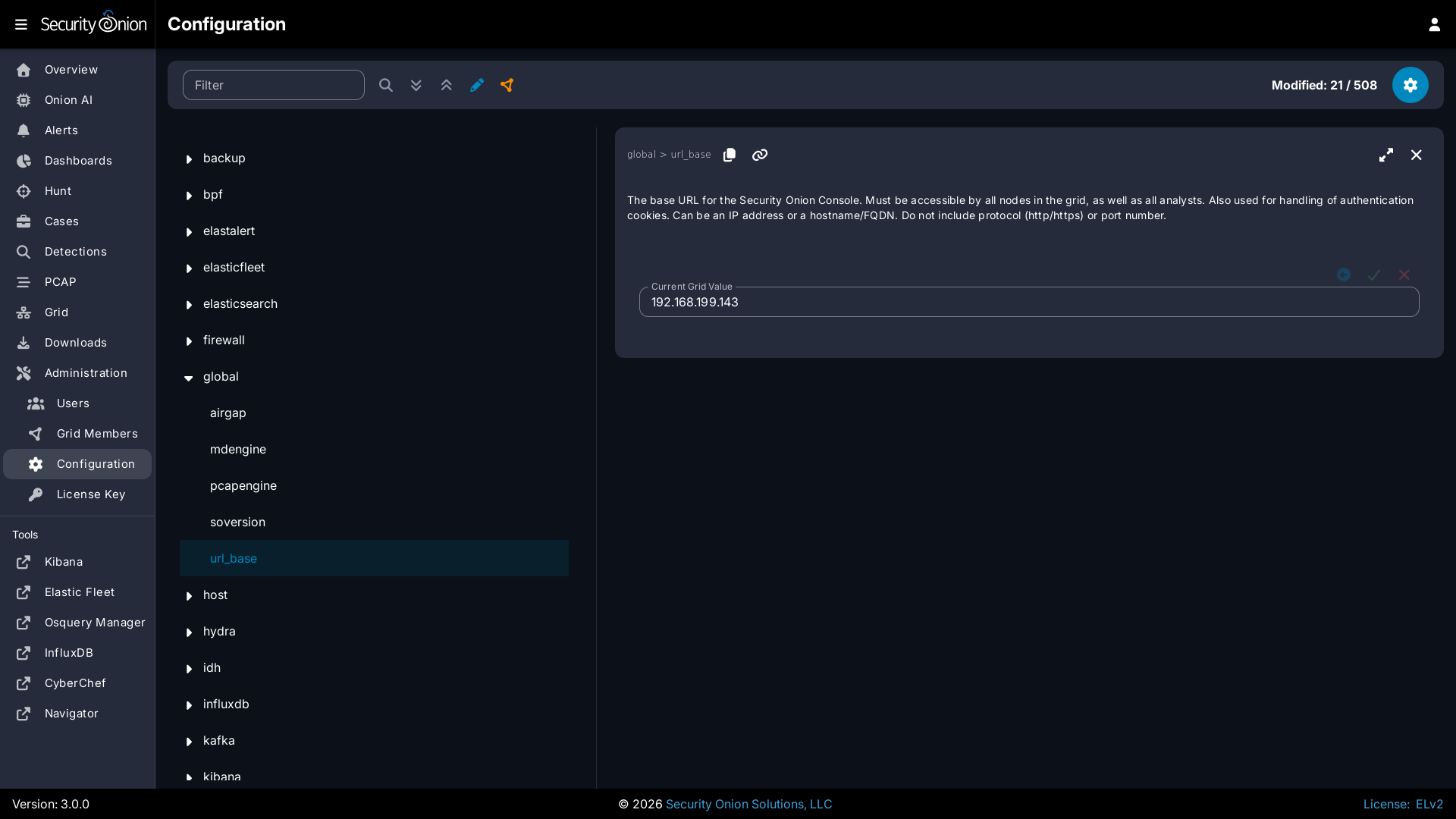 If you need to change the URL for web access to Security Onion (for example, from IP to FQDN), go to Administration --> Configuration --> global --> url_base. Enter the new URL in the field on the right and then click the checkmark to save the new setting.